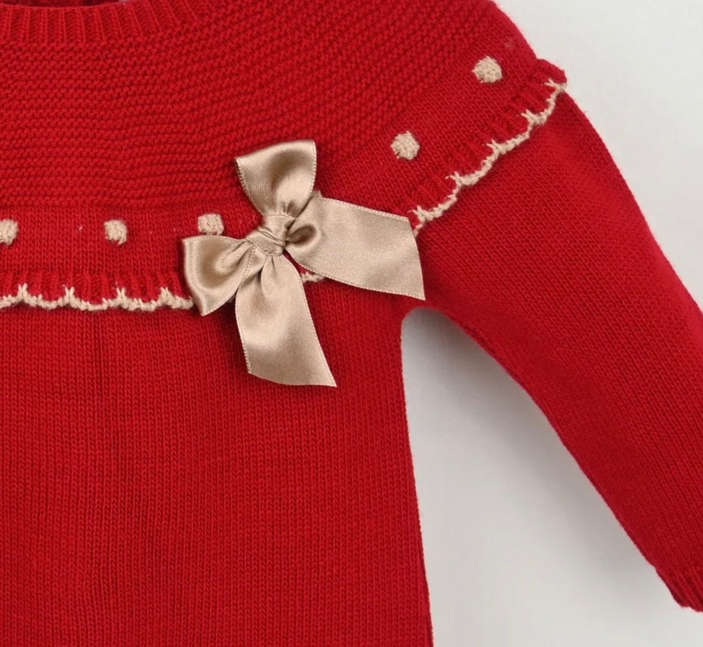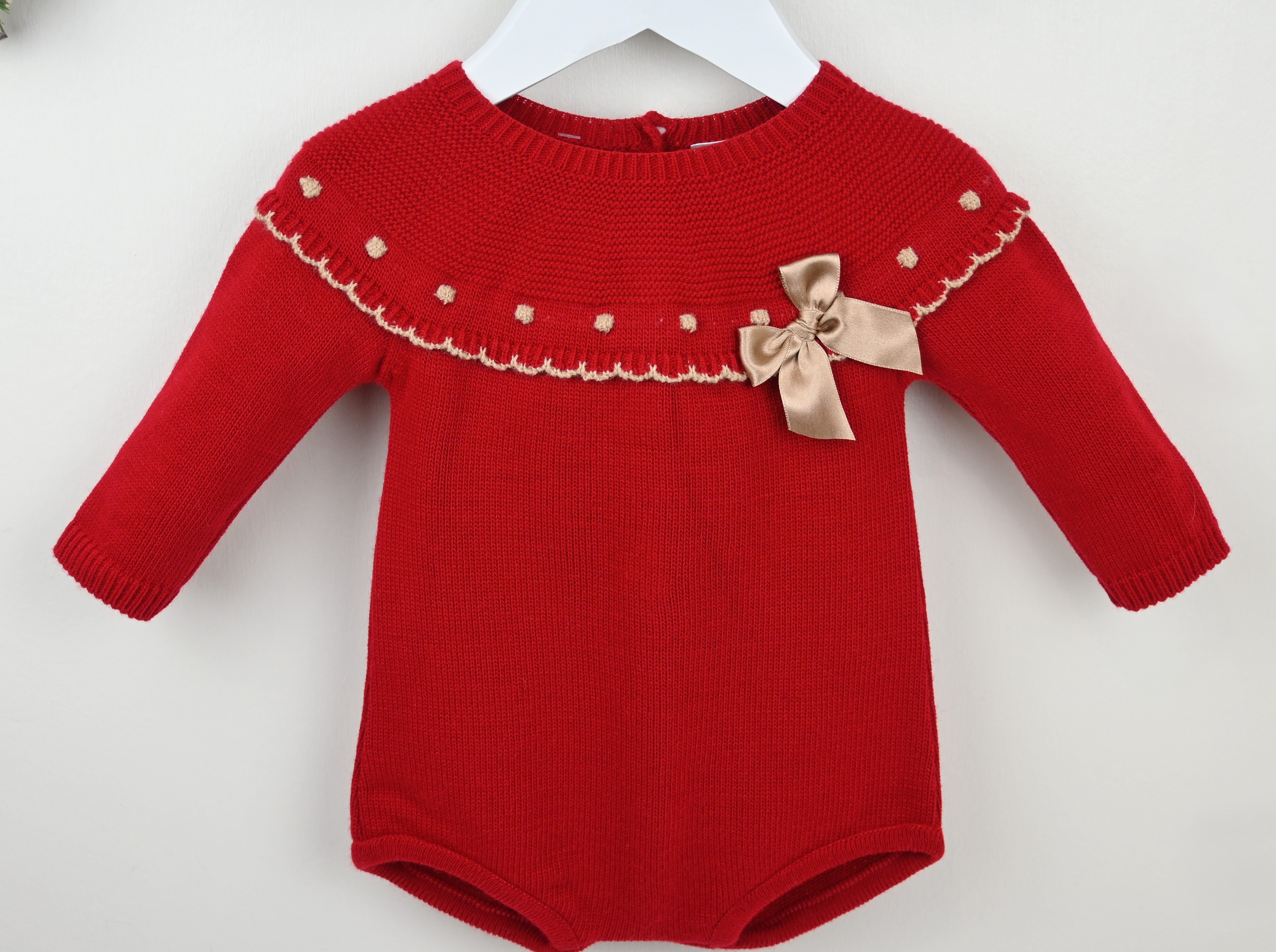 Knitted in supersoft red yarn, the Amber Romper is a baby girls one piece with pretty gold details across the bodice and shoulders along with an elegant ribbon bow. Just perfect for making special memories with your little one this festive season.