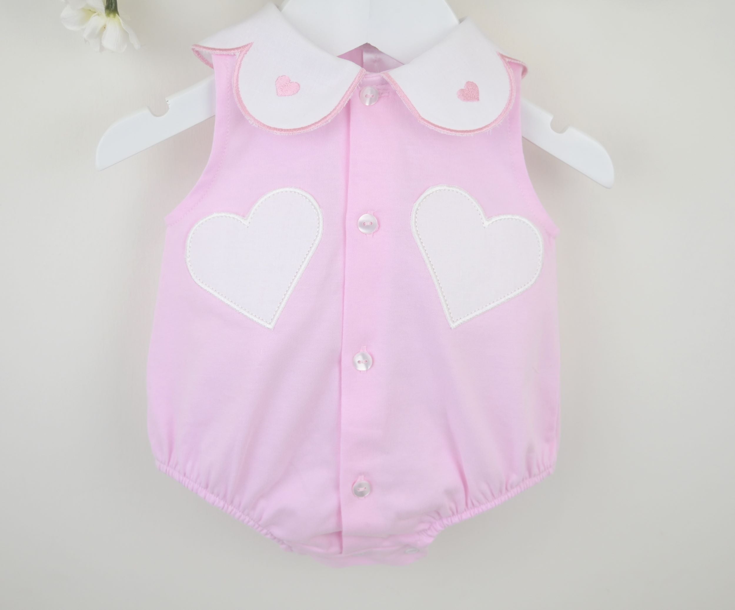 The Beatrice Romper is a stunning baby girl one piece cotton outfit for the new season. With a pretty petal style collar with dainty embroidered hearts, adorable white heart patches at the tummy. It is complete with elasticated legs.
