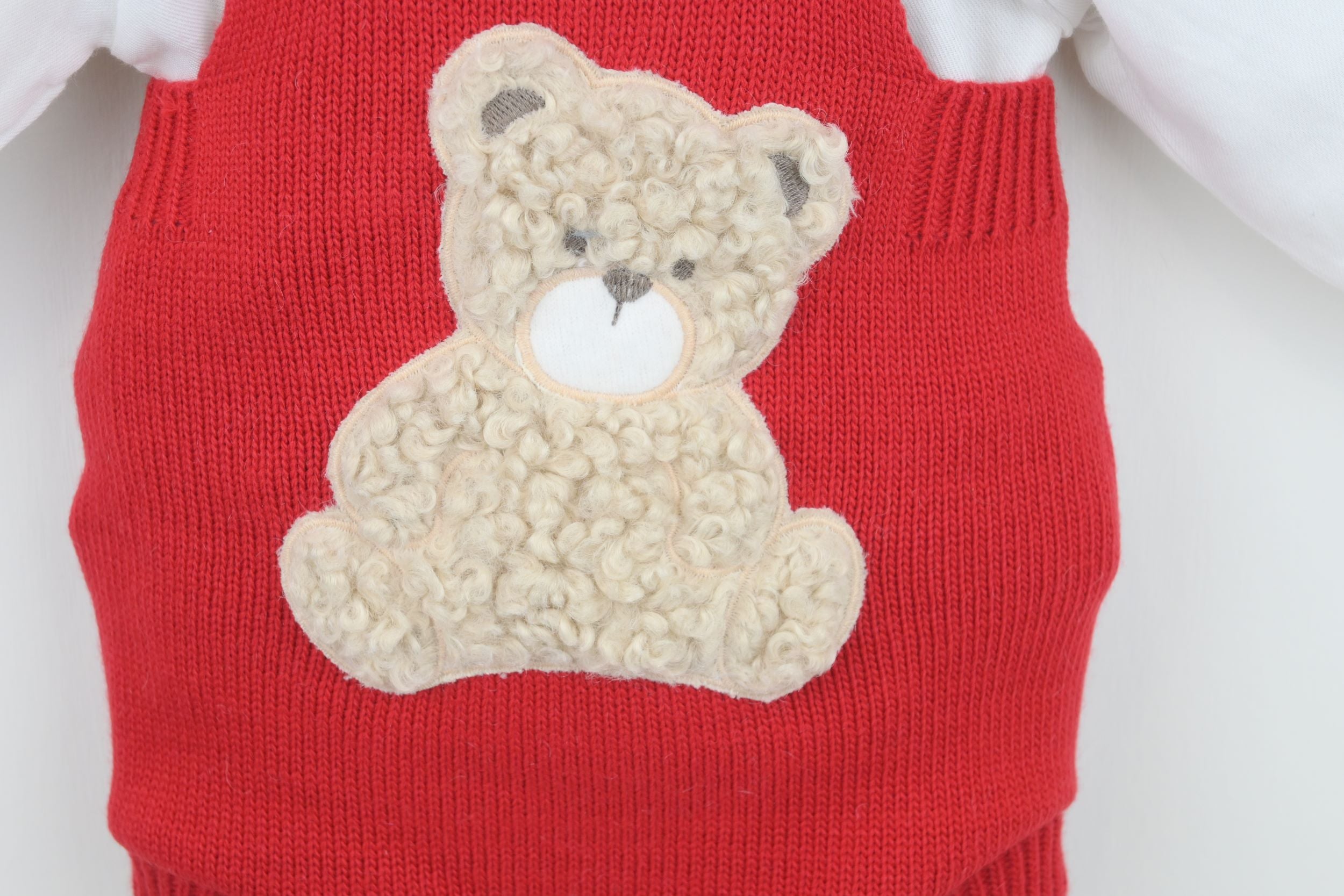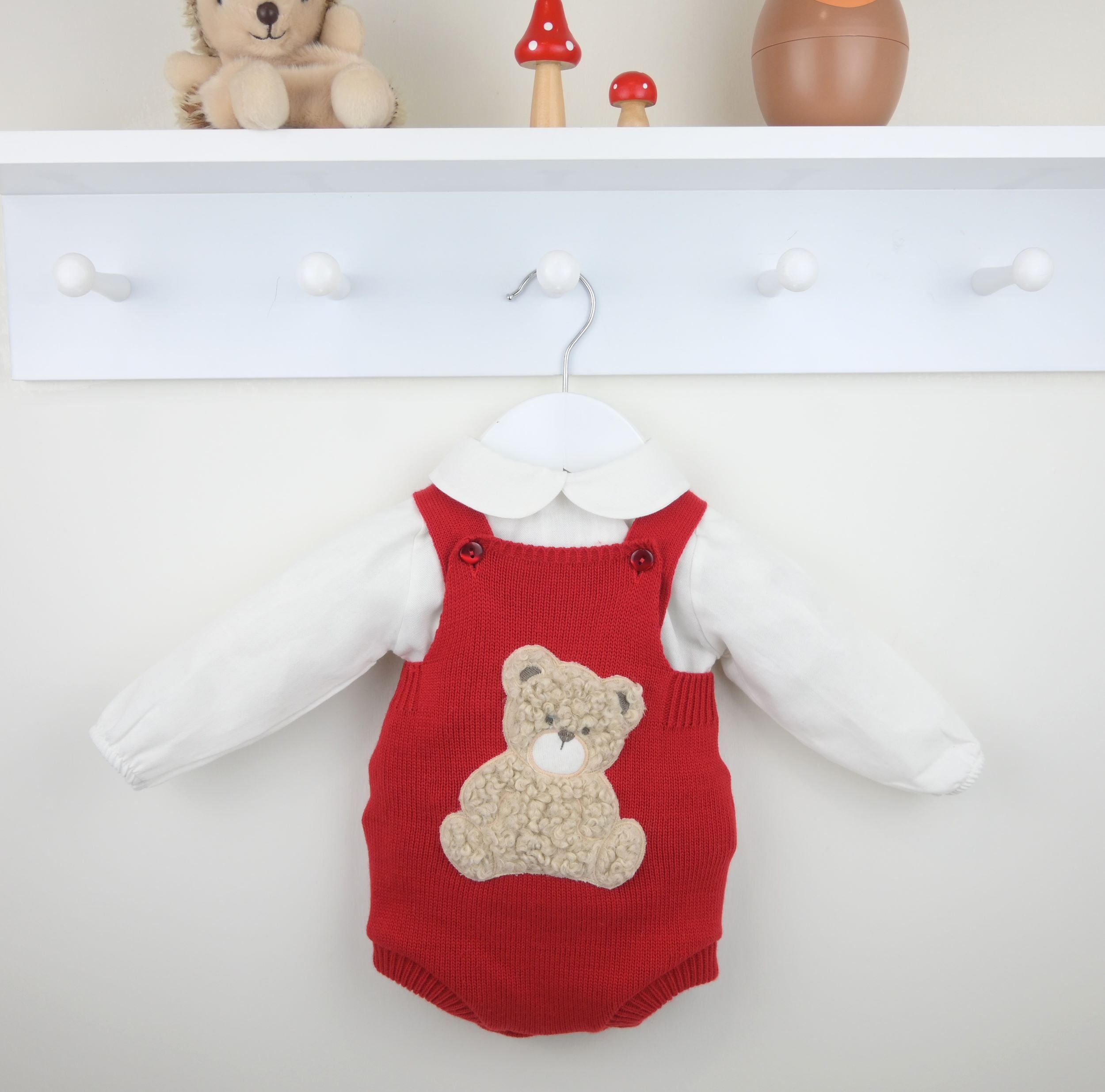 The adorable Boys Bear Outfit Red is a new season favourite! The dungaree suit is knitted in a supersoft red yarn and has the cutest furry bear applique at the front. This lovely outfit has super-comfort elasticated legs and waist and a gently brushed cotton blouse in pale ivory.