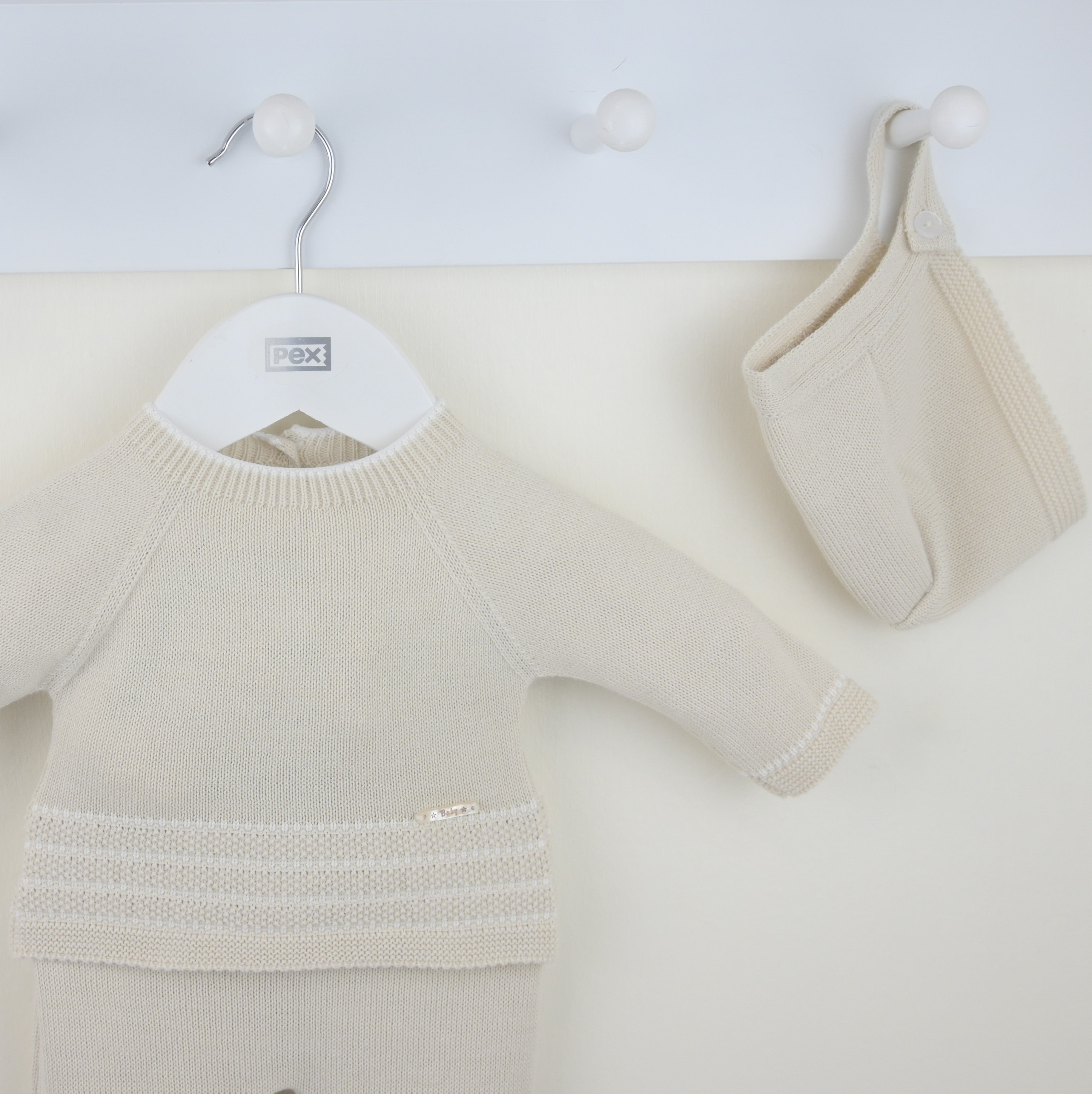 Knitted in super-soft yarn, this little boys Ciaran Suit Natural is comfy as well as ultra stylish. The smart top has classic textured stripes towards the hem and at the cuffs, with convenient buttons running down the back. The matching trousers have cosy enclosed feet and a comfortably elasticated waistband. It comes complete with a matching bonnet.