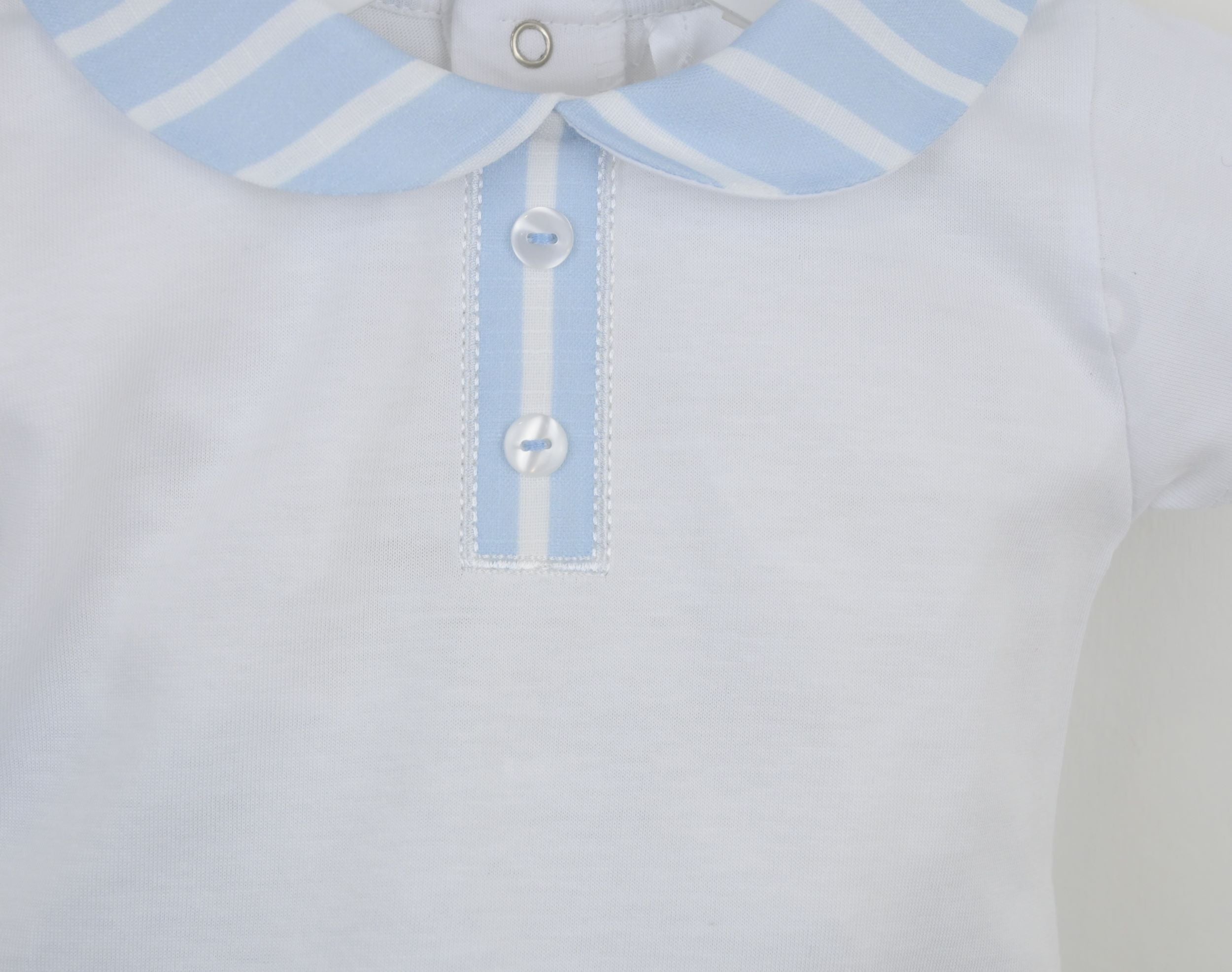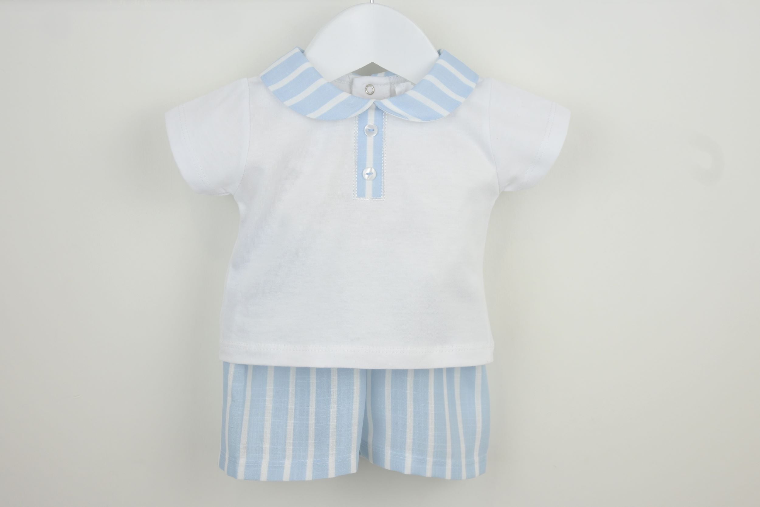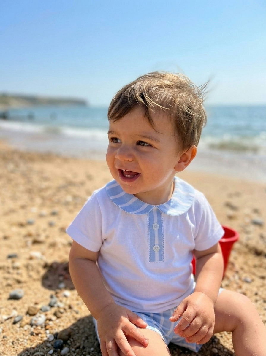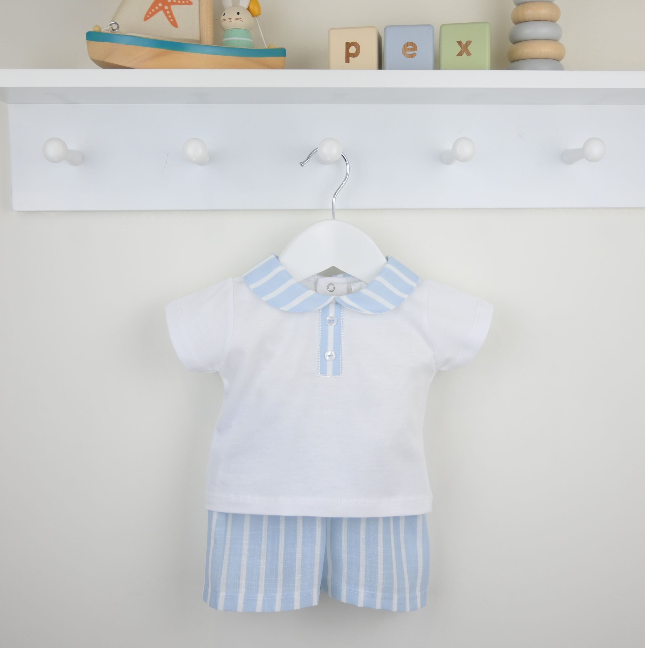 A bright and breezy looking baby boy two piece suit for Summer. The Frankie Shorts Suit has a white cotton top with a contrast blue striped collar and placket detail with ornamental buttons. The coordinating shorts are in the lightweight striped fabric and have a comfortably elasticated waist.