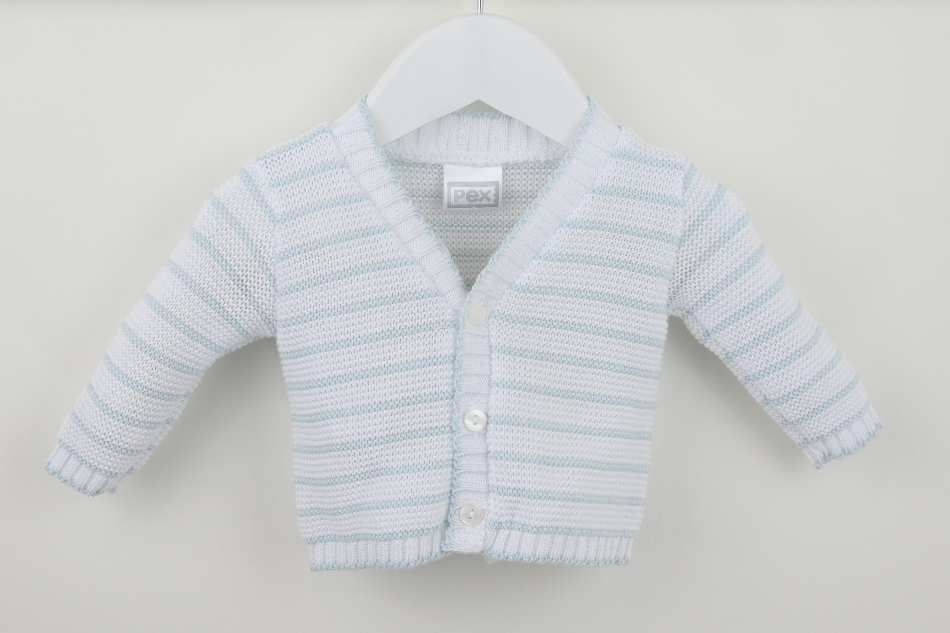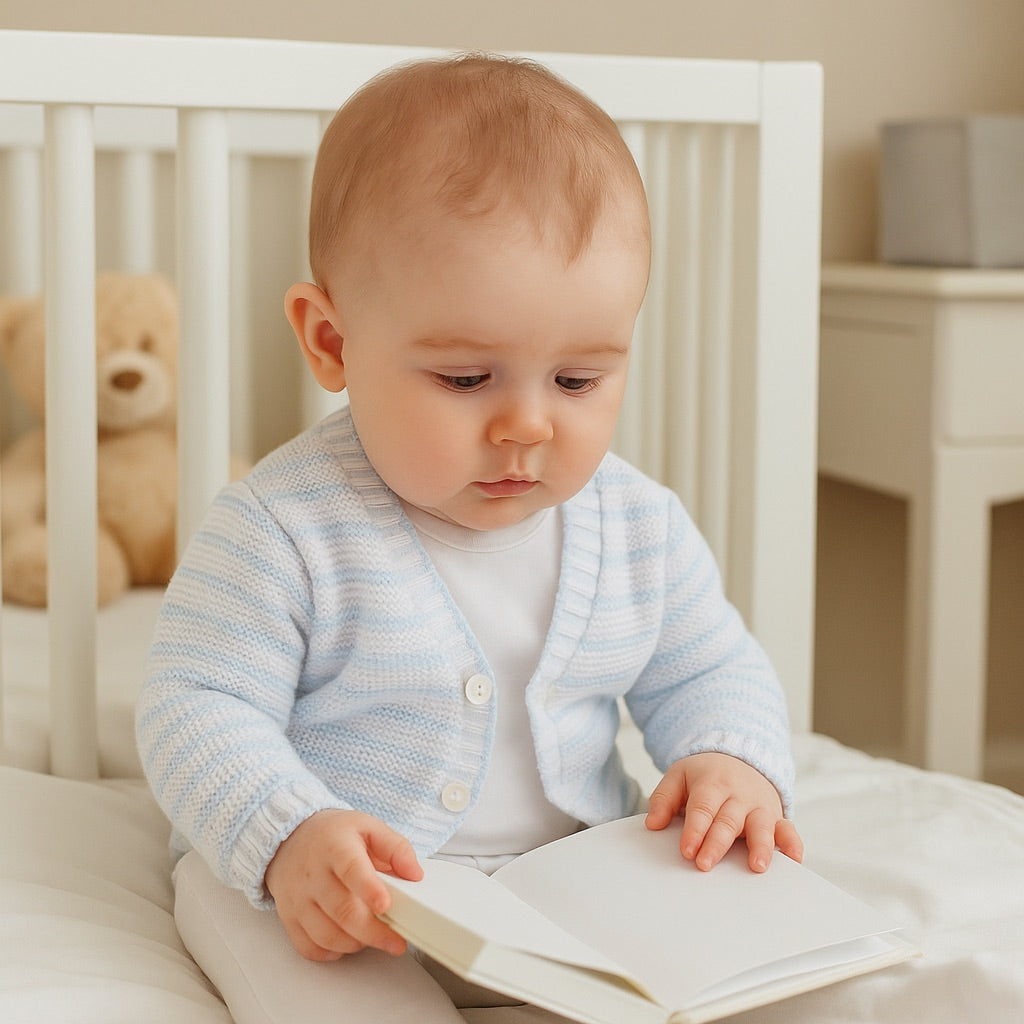 The pure cotton Jacob Baby Cardigan White is the perfect baby boys cardigan for any special outfit. Classically designed with soft knit details, we love the contrast blue stripes and adorable edging along the hem.