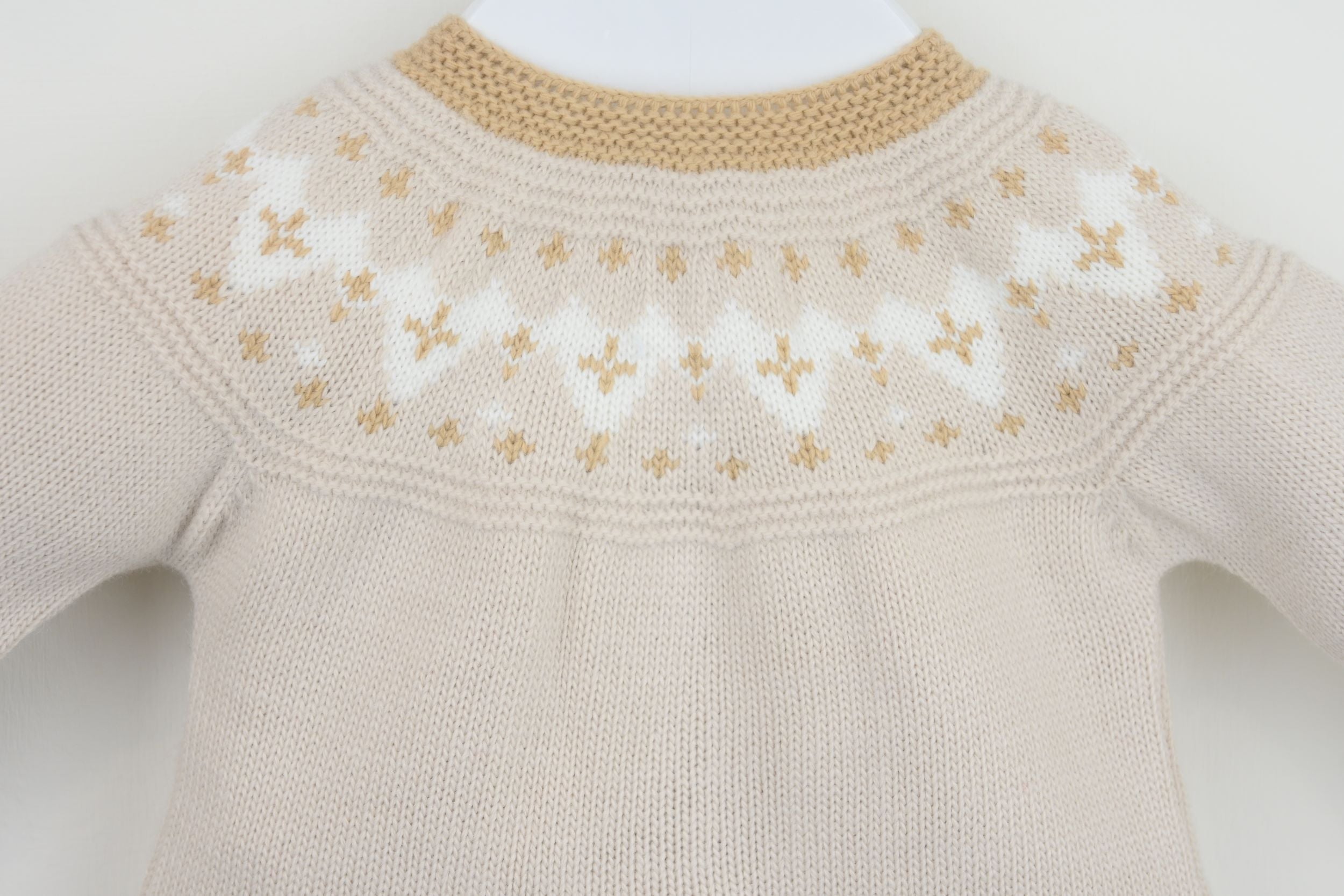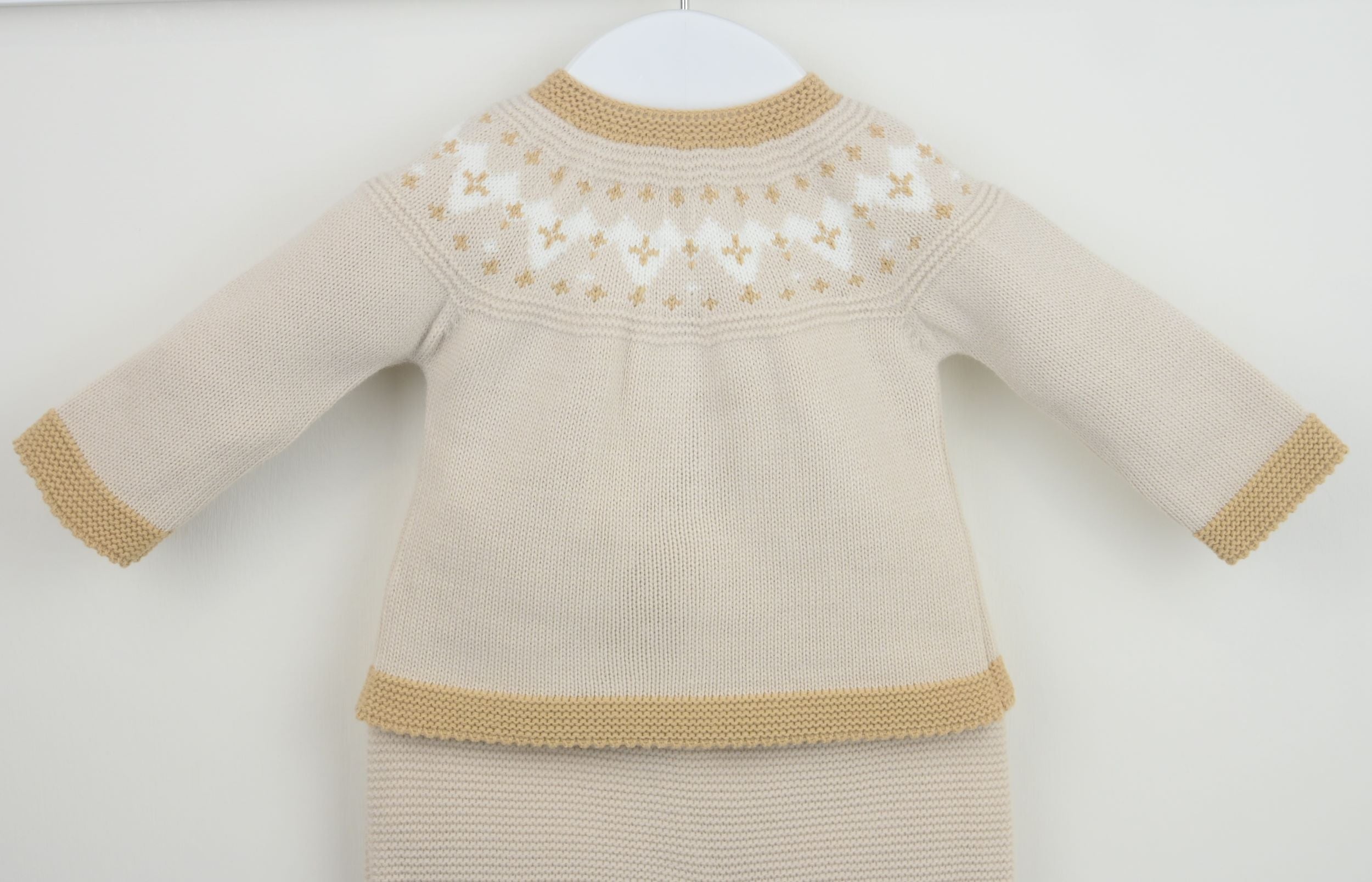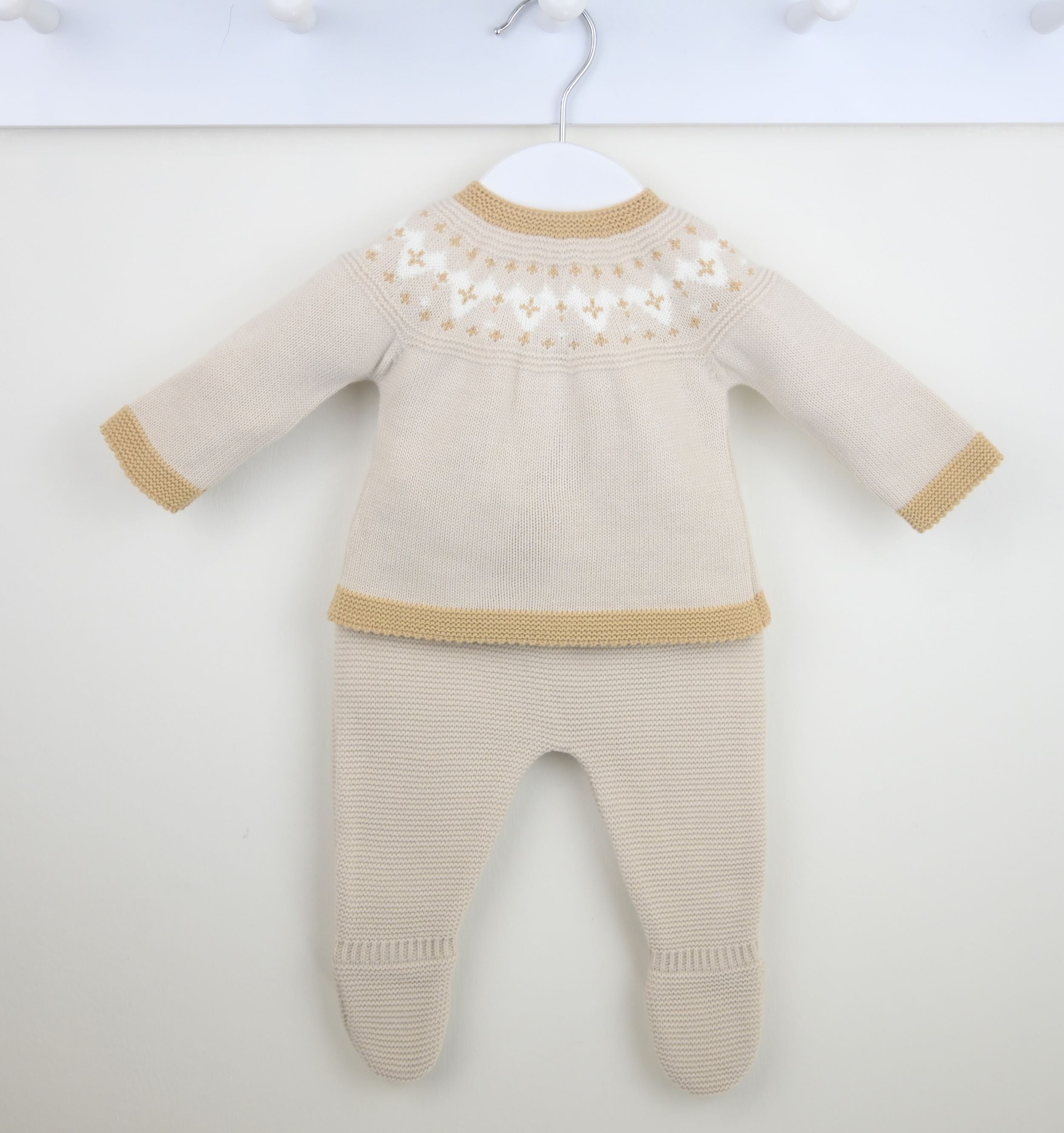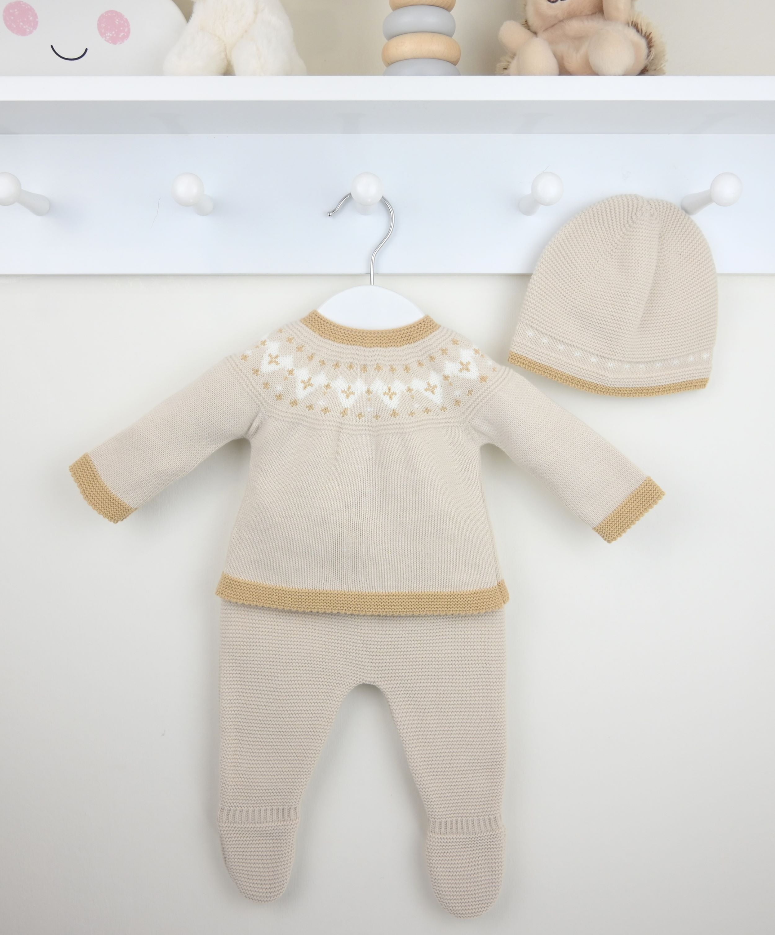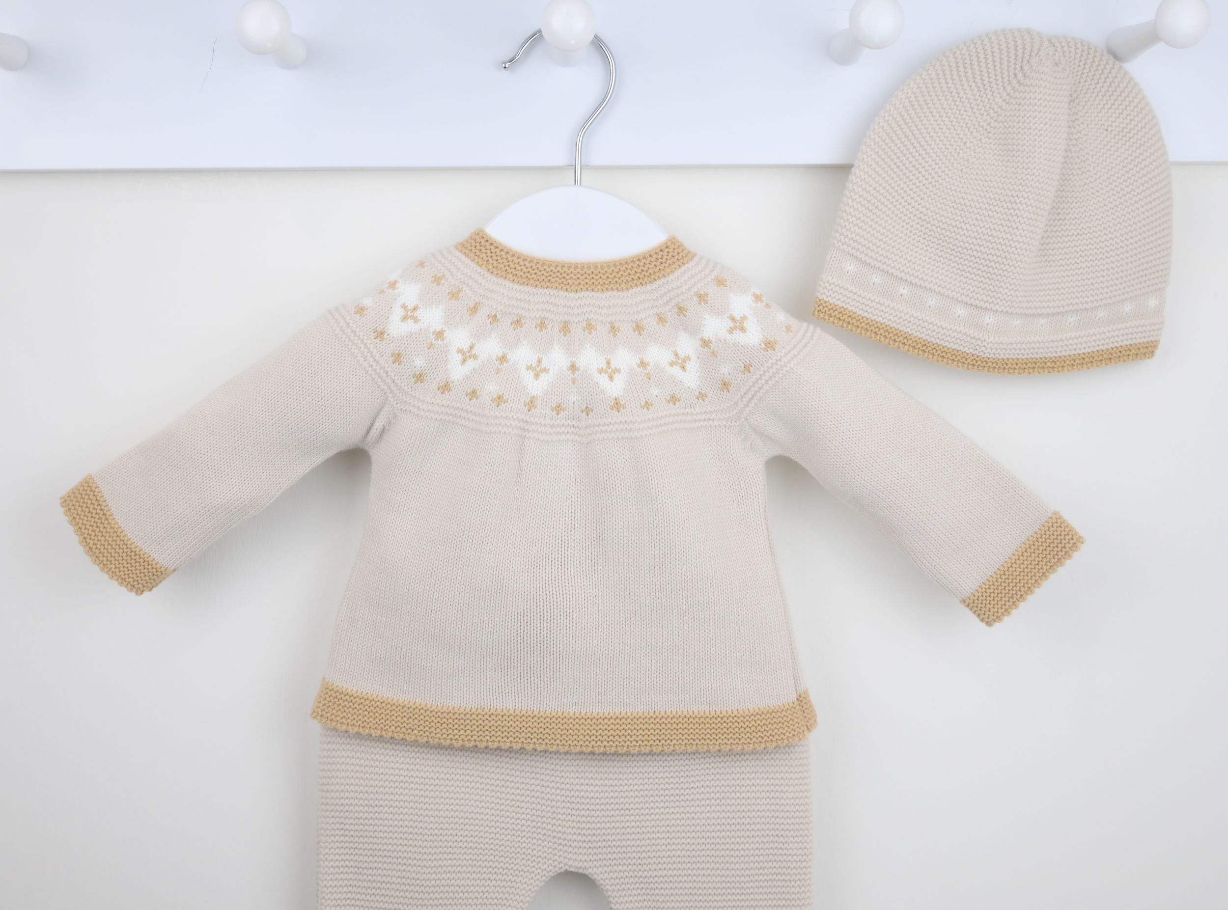 A lovely knitted three piece suit for Winter, the Jax Suit Natural is beautifully supersoft, with a smart beige and white contrast design. The trousers have cosy enclosed feet and a comfortably elasticated waist. Complete with a matching knitted hat.