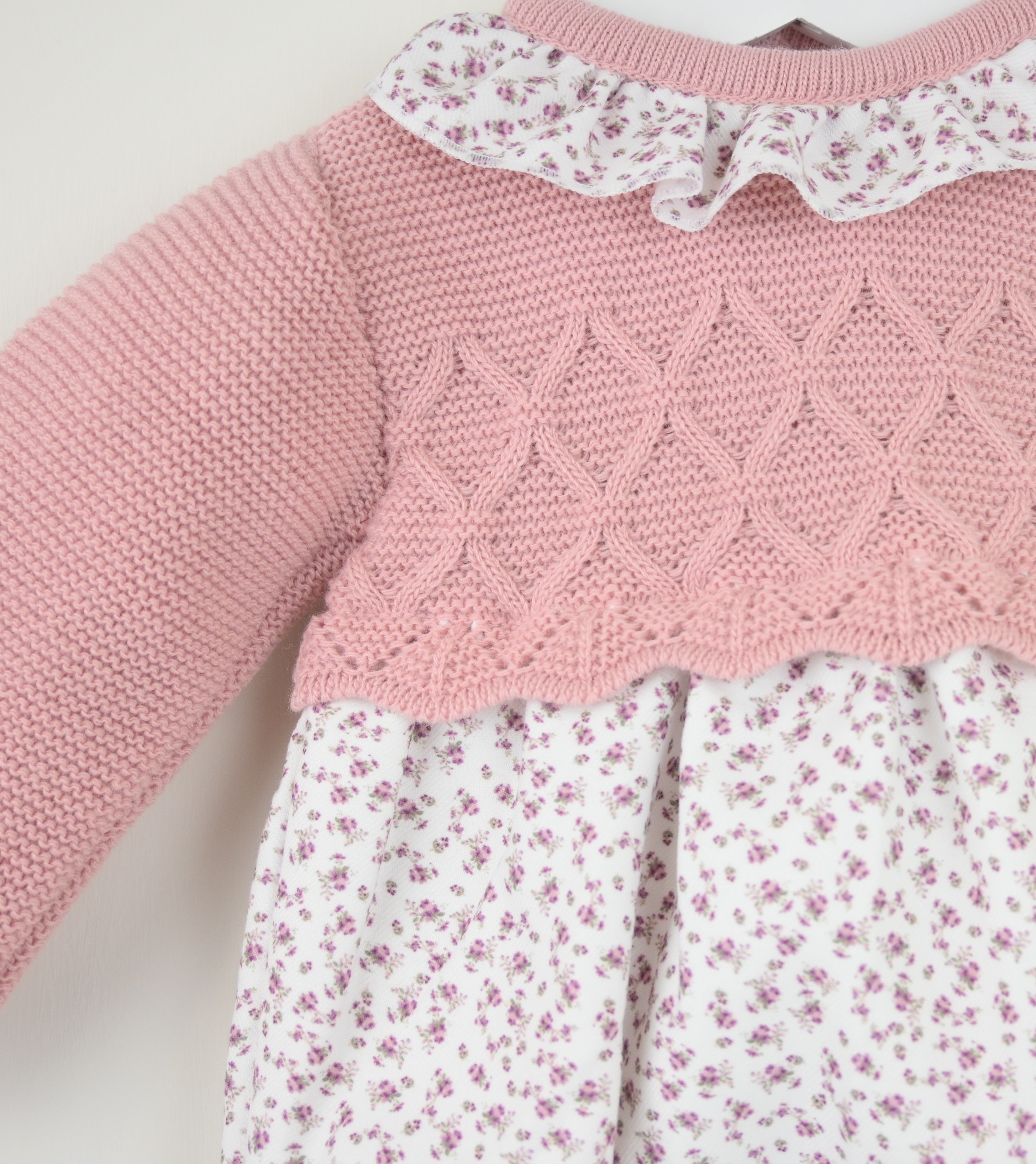 The adorable Leah Romper Dusky Pink has a cosy knitted bodice featuring a pretty lattice pattern and scalloped edge, just perfect for the cooler months. Gorgeous knitted details along the cuffs and neckline finish this timeless look. The bottom and the collar are both in a pretty ditsy print woven fabric, and the bottom is lined for extra warmth.