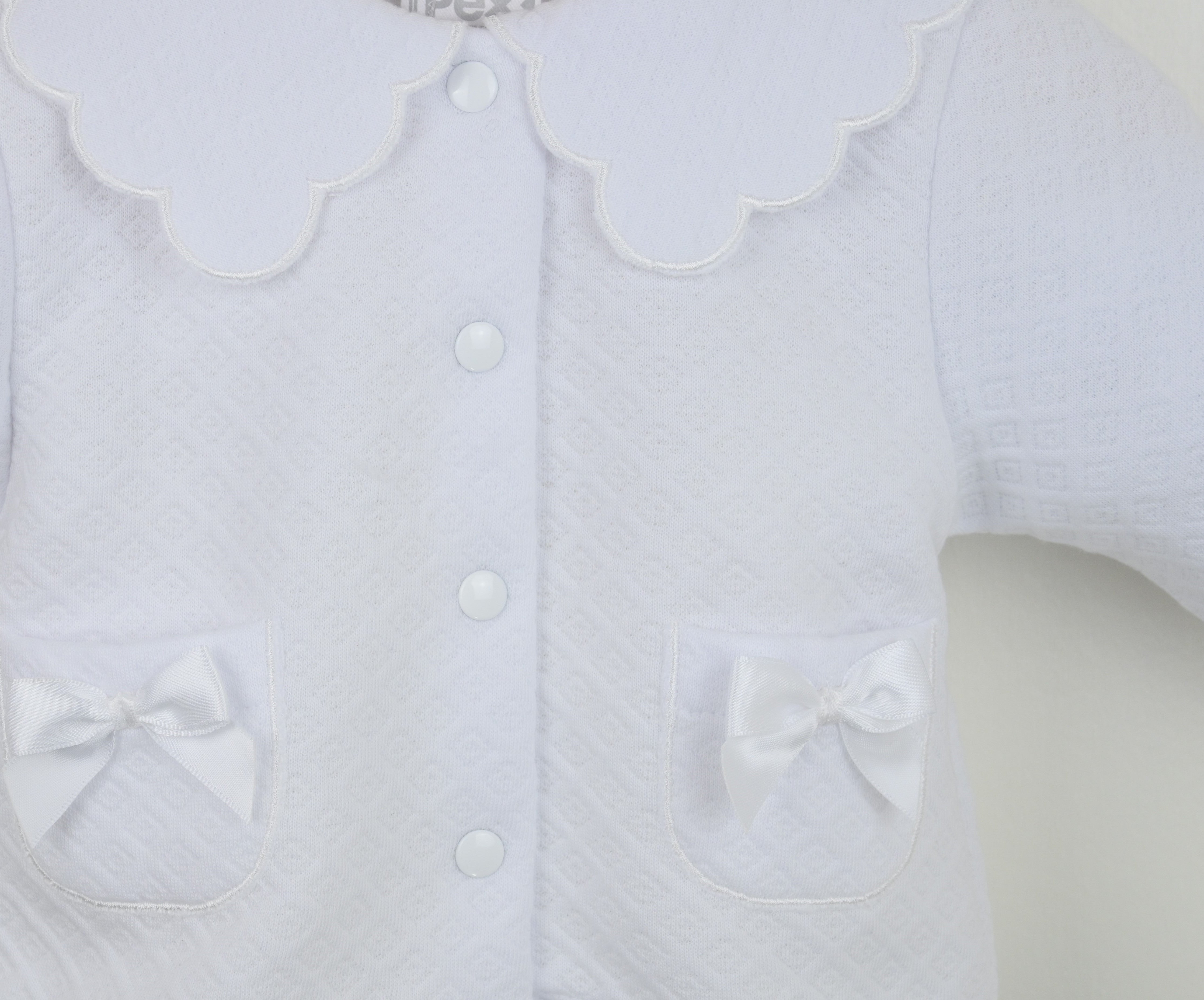 An adorable extra layer for all seasons. The Leila Jacket White completes any special baby girls outfit, made in a pure white textured cotton with the most beautifully scalloped collar and pretty ribbon bows at the pockets.