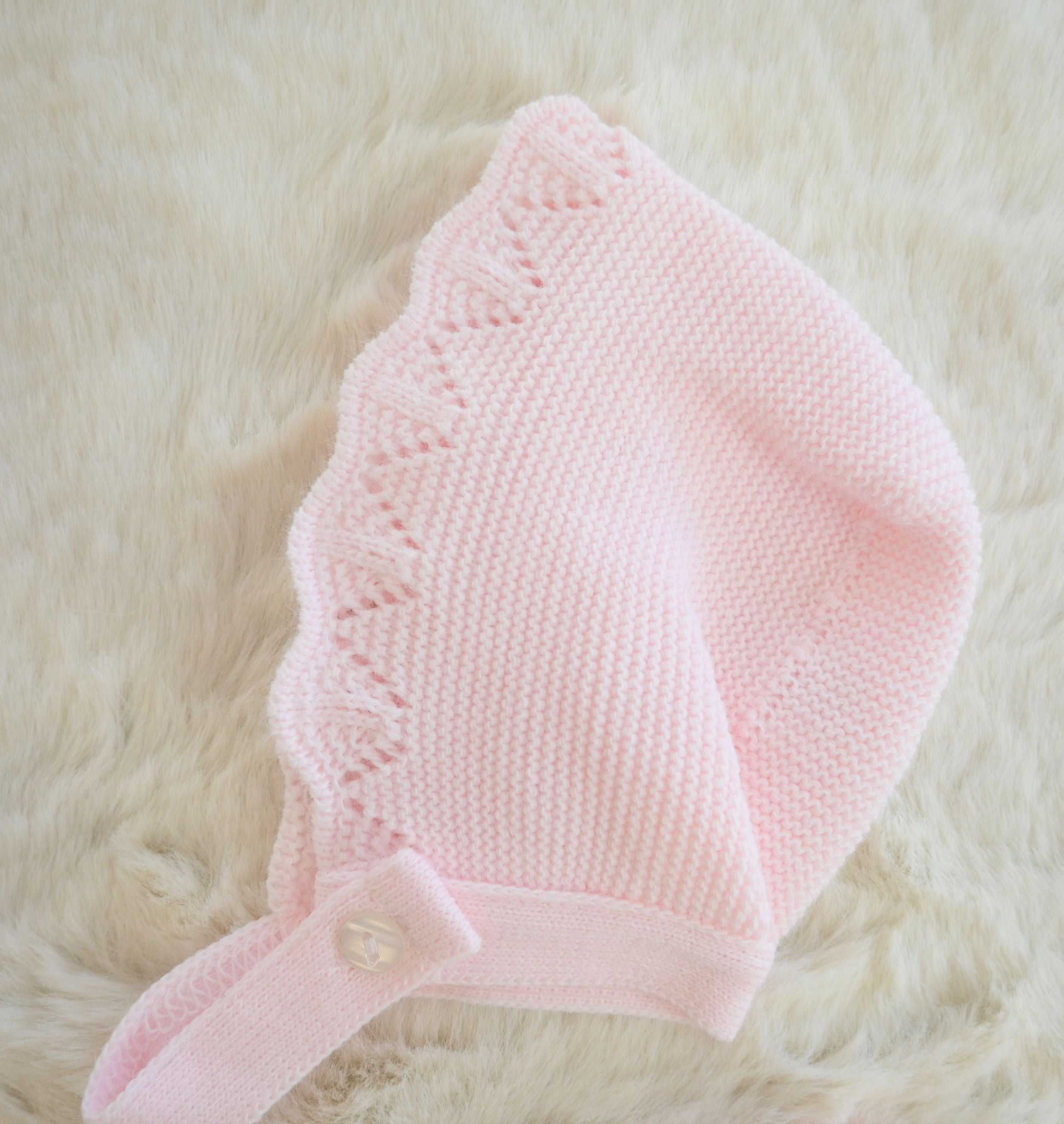The Lilibeth Outfit Pink is an adorable pastel pink 3 piece outfit knitted in super-soft and comfortable acrylic. Absolutely superb quality, the knitted top has a beautifully textured frilled collar and pretty chevron patterned chest with textured trims to the hem and sleeves. The matching trousers have cosy enclosed feet along with a comfortably elasticated waist. The outfit is complete with a cute little coordinating bonnet.
