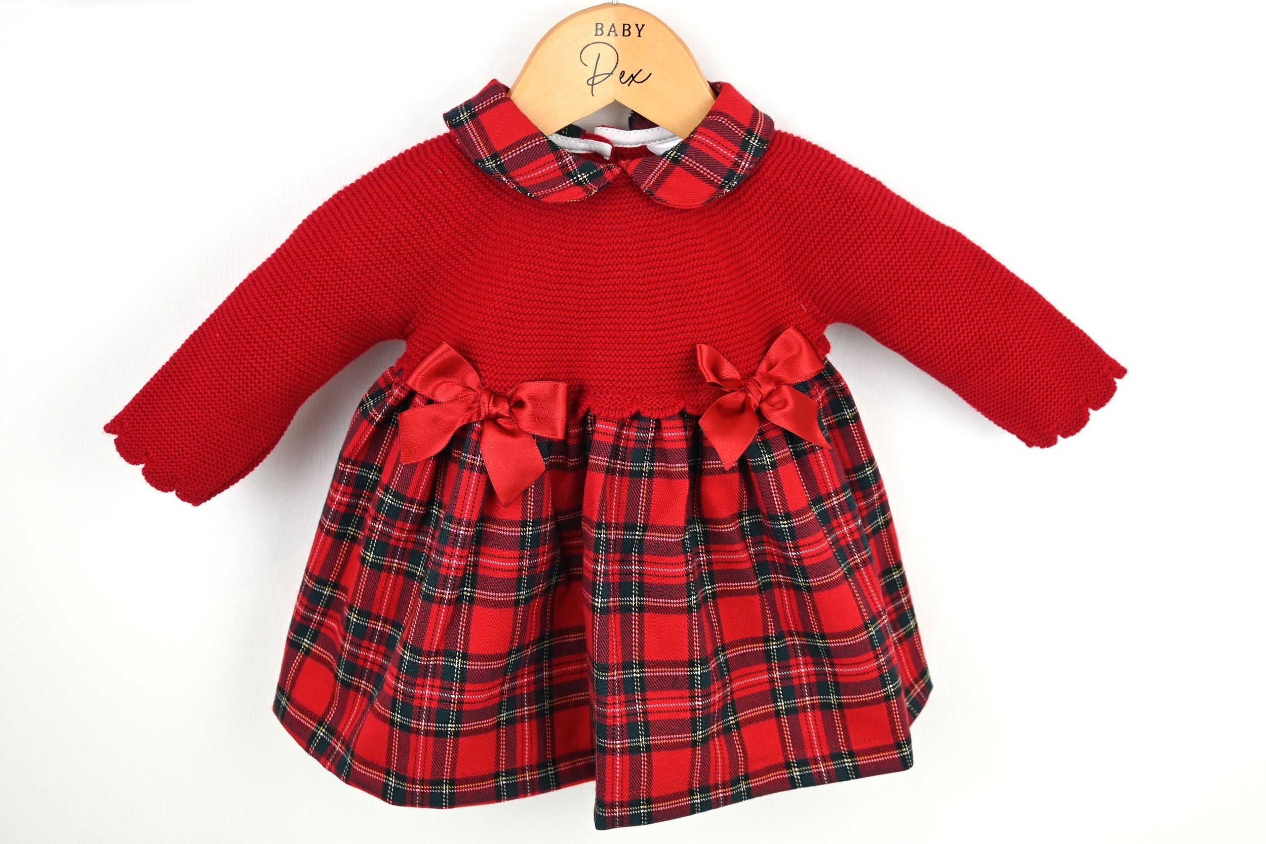 Crafted in a beautifully soft, rich red yarn with a festive tartan fabric skirt and collar, the Merrie Dress is a perfect for a special occasion! The skirt is lined for added comfort and warmth.