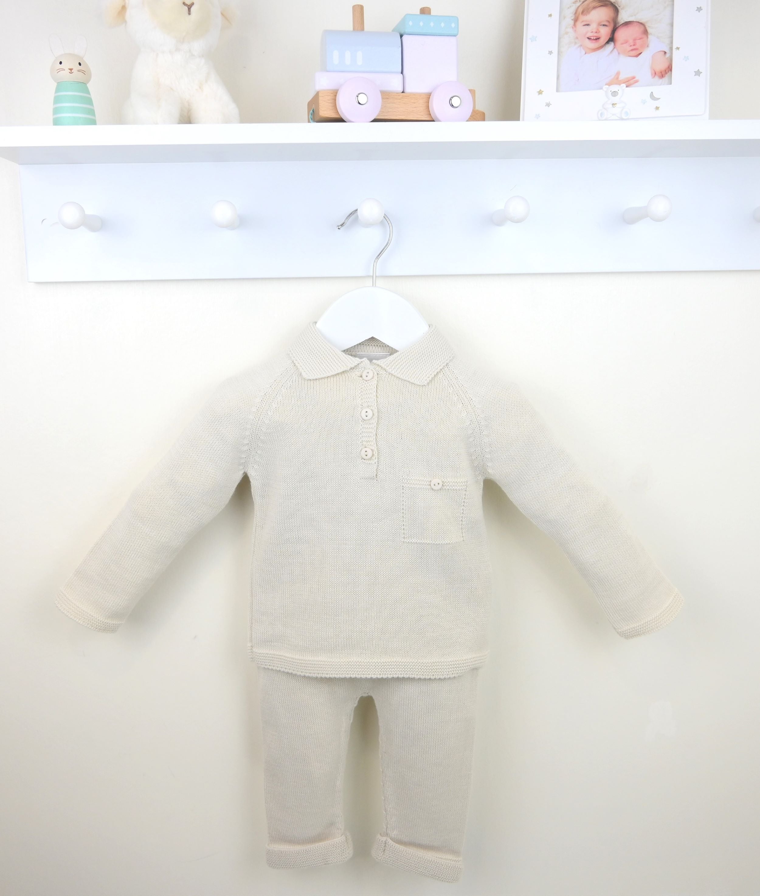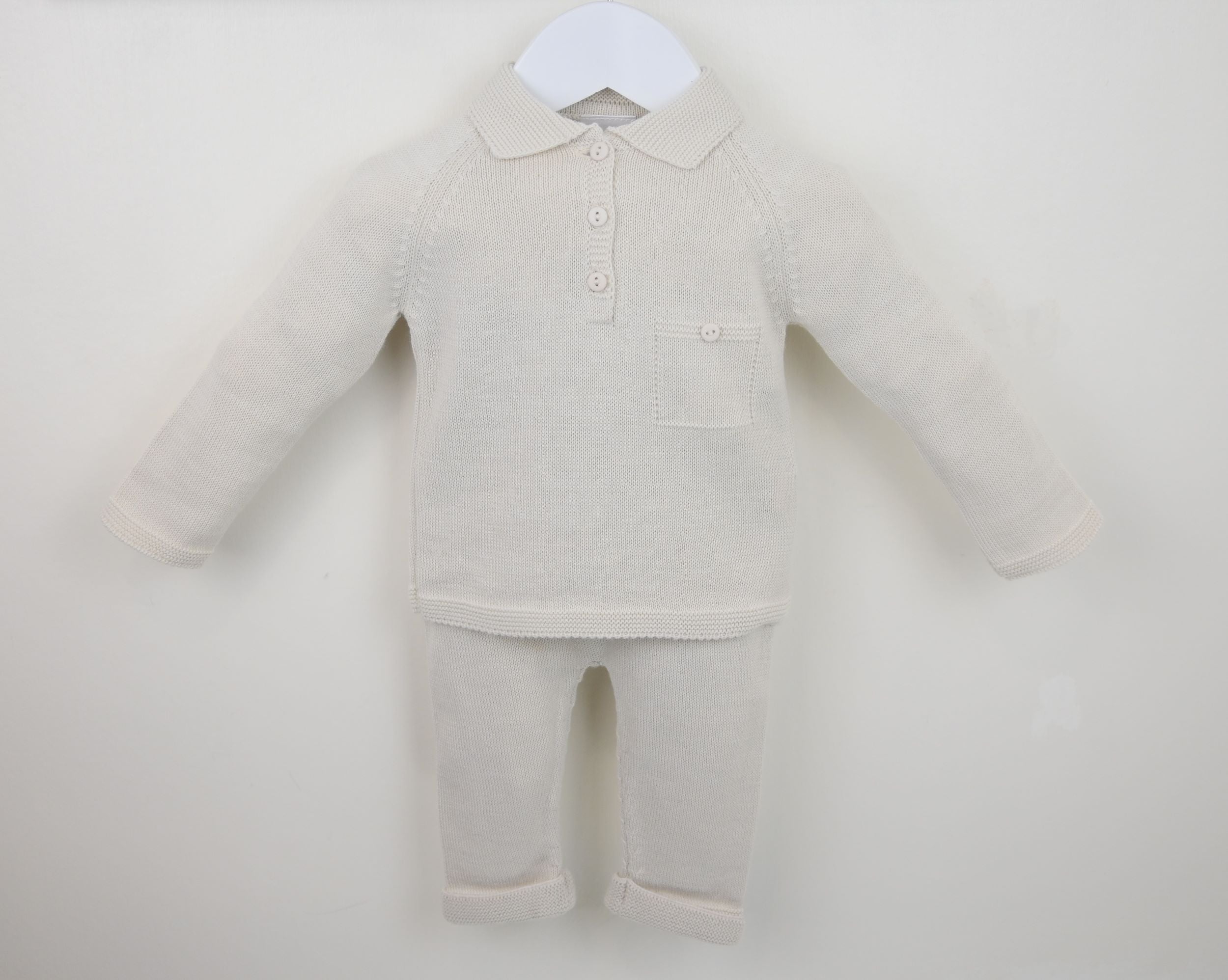 Knitted in super smart soft natural yarn, the Oliver Polo Collar Suit Natural is a perfect classic little boys outfit. Comfy as well as ultra stylish, the smart top has a traditional polo style collar buttoned neck with smart mock buttoned pocket at the chest. The matching trousers have super smart turn up cuffs and a comfortably elasticated waistband.