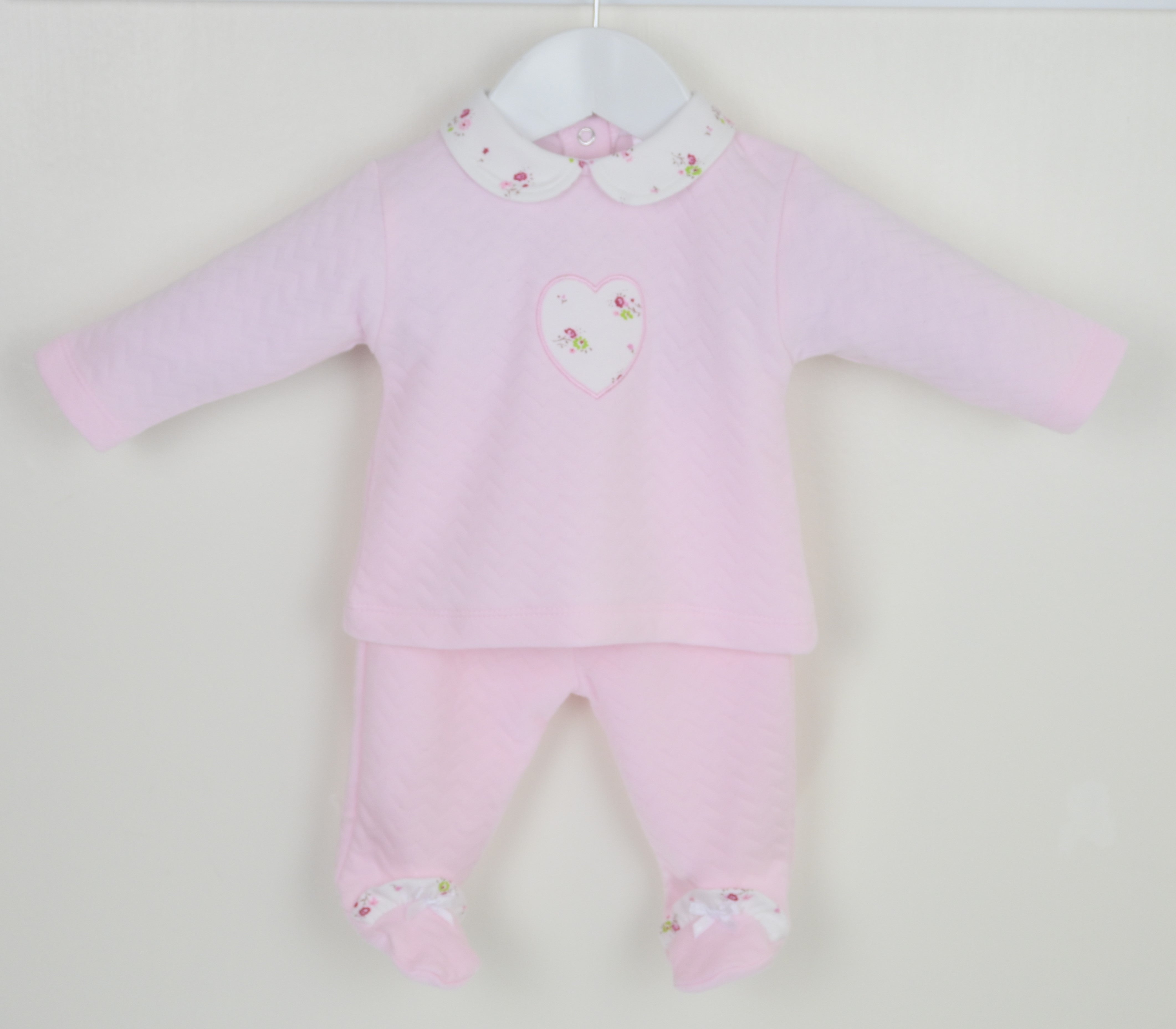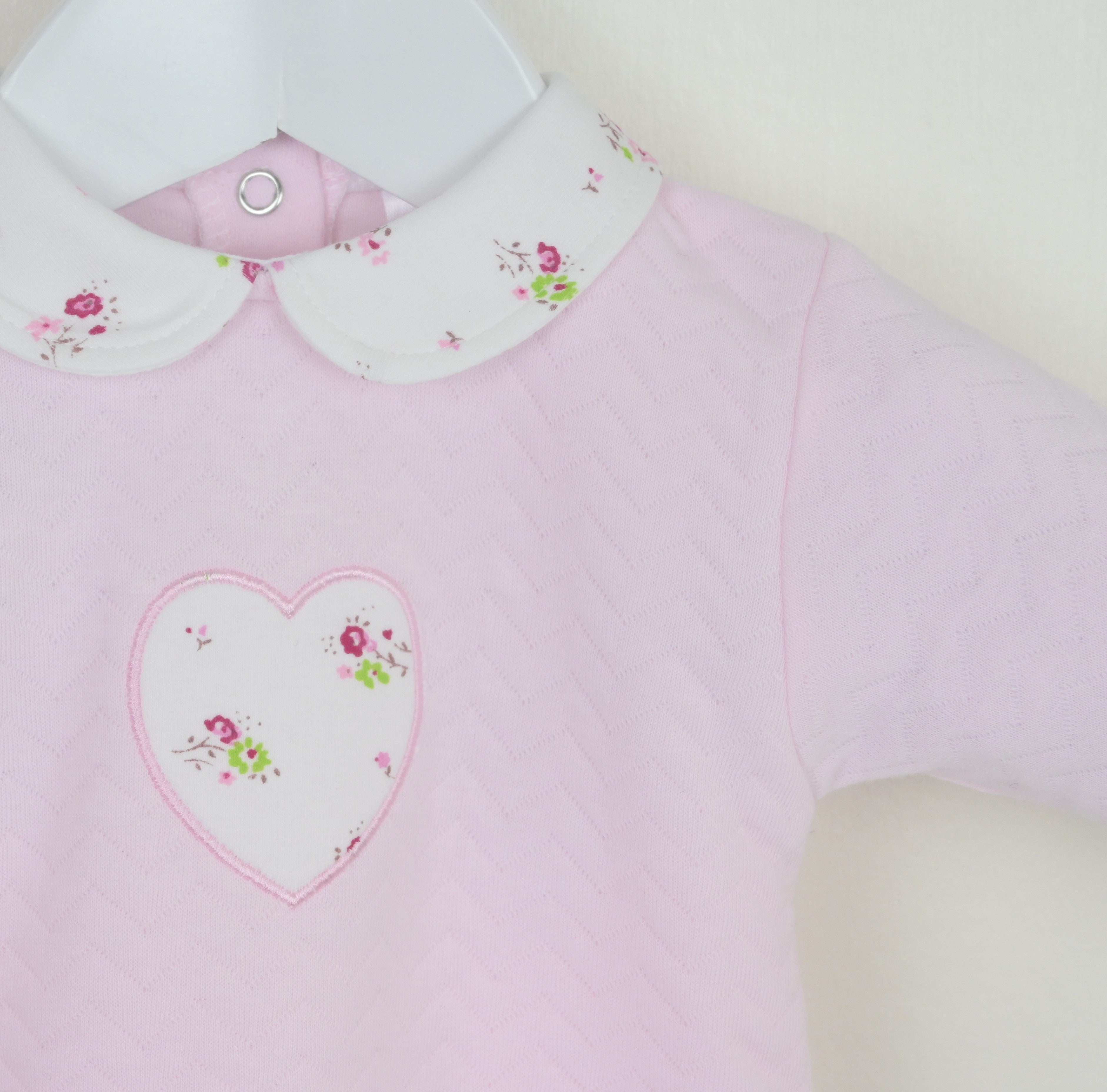 An adorable and wonderfully warm two piece set, the Sweetheart Outfit is made in a lovely textured cotton material for warmth and comfort. At the chest there is the cutest ditsy print heart applique and there are coordinating details at the feet.