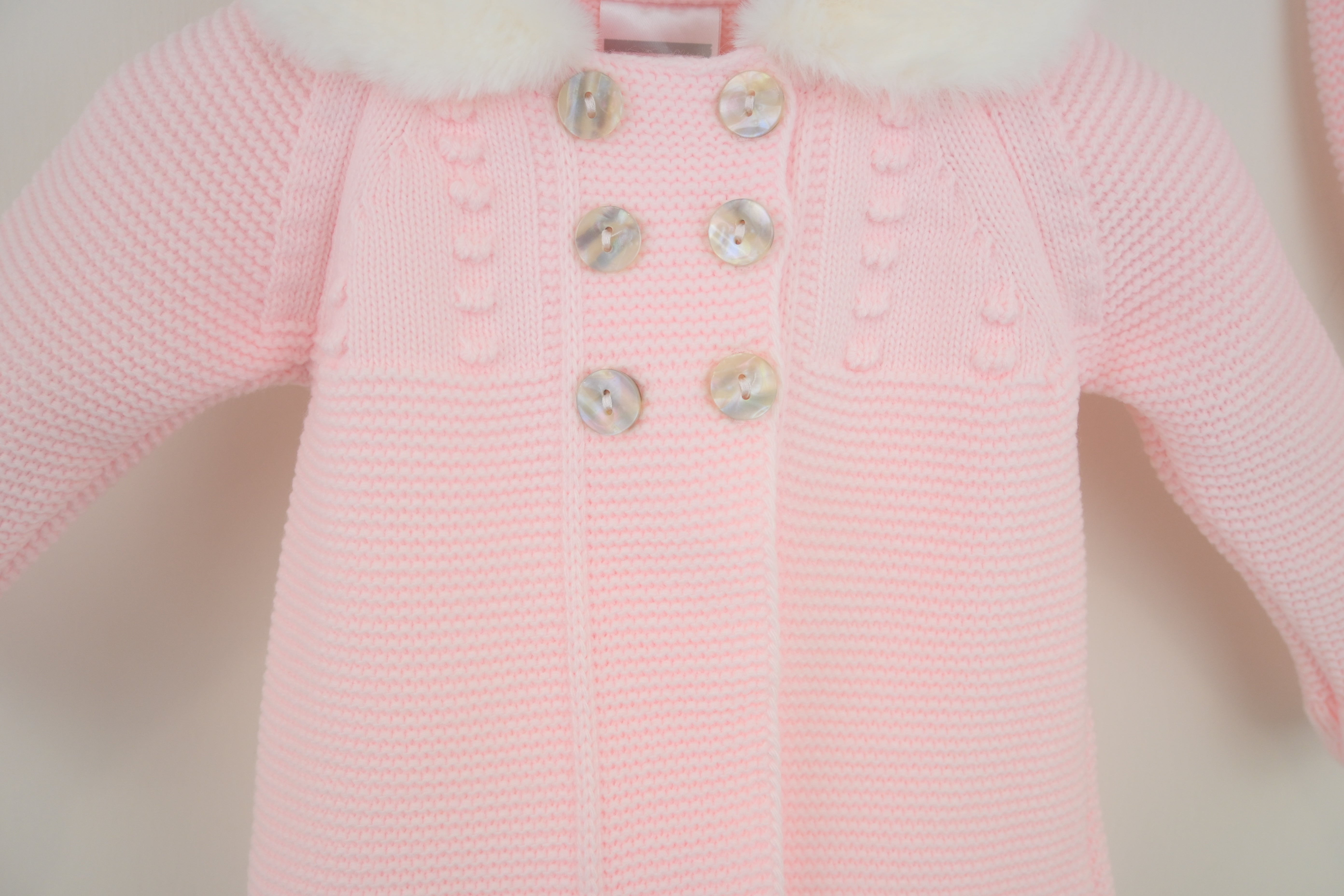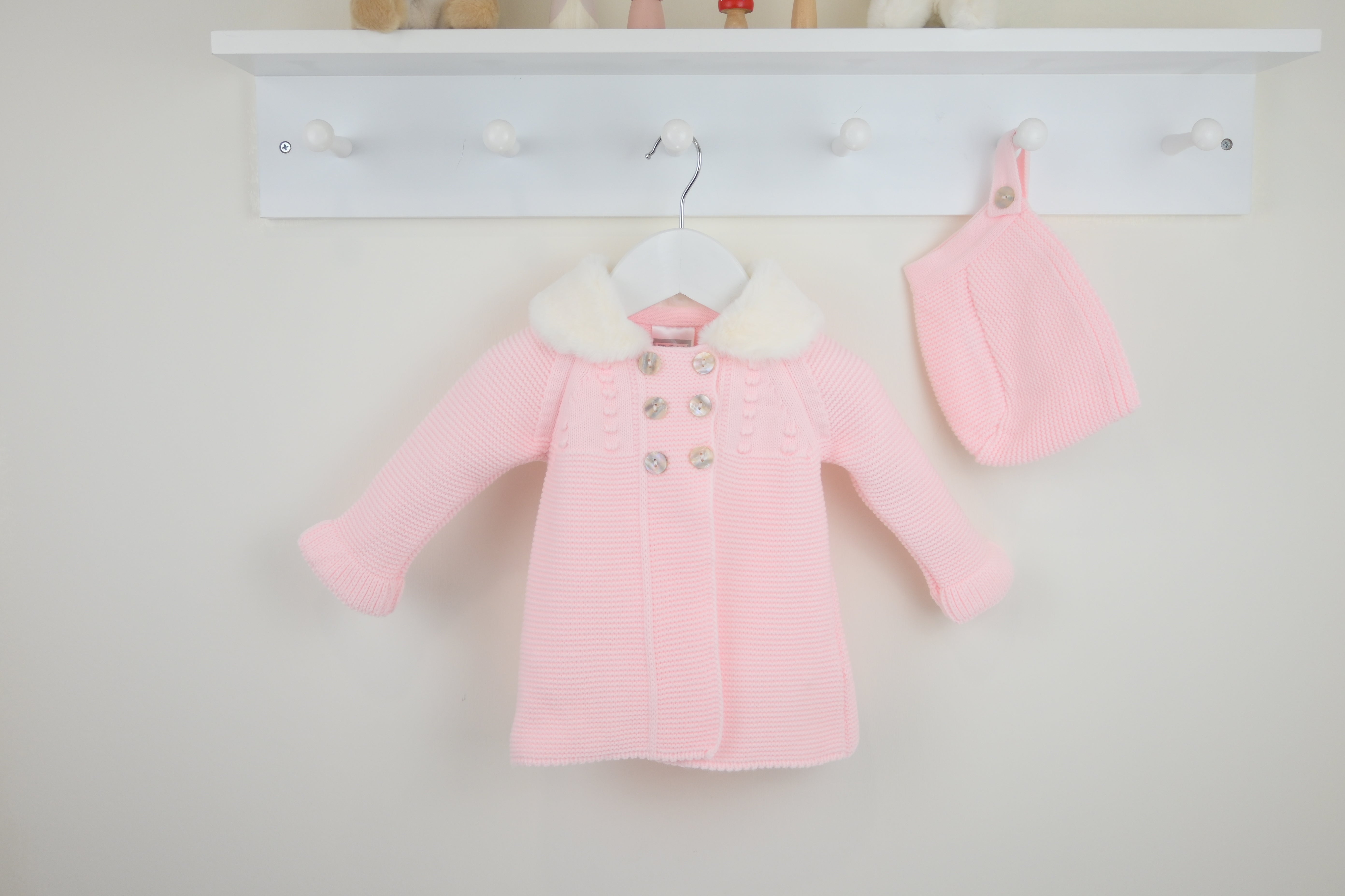 A showstopper for the new season. Knitted in the softest fibres with a fabulous faux fur collar, wrap your little one up in style in the Tamsin Coat Pink! Featuring double breasted mother of pearl buttoning with pretty textured knit patterns, this coat comes complete with a cute matching knitted bonnet.