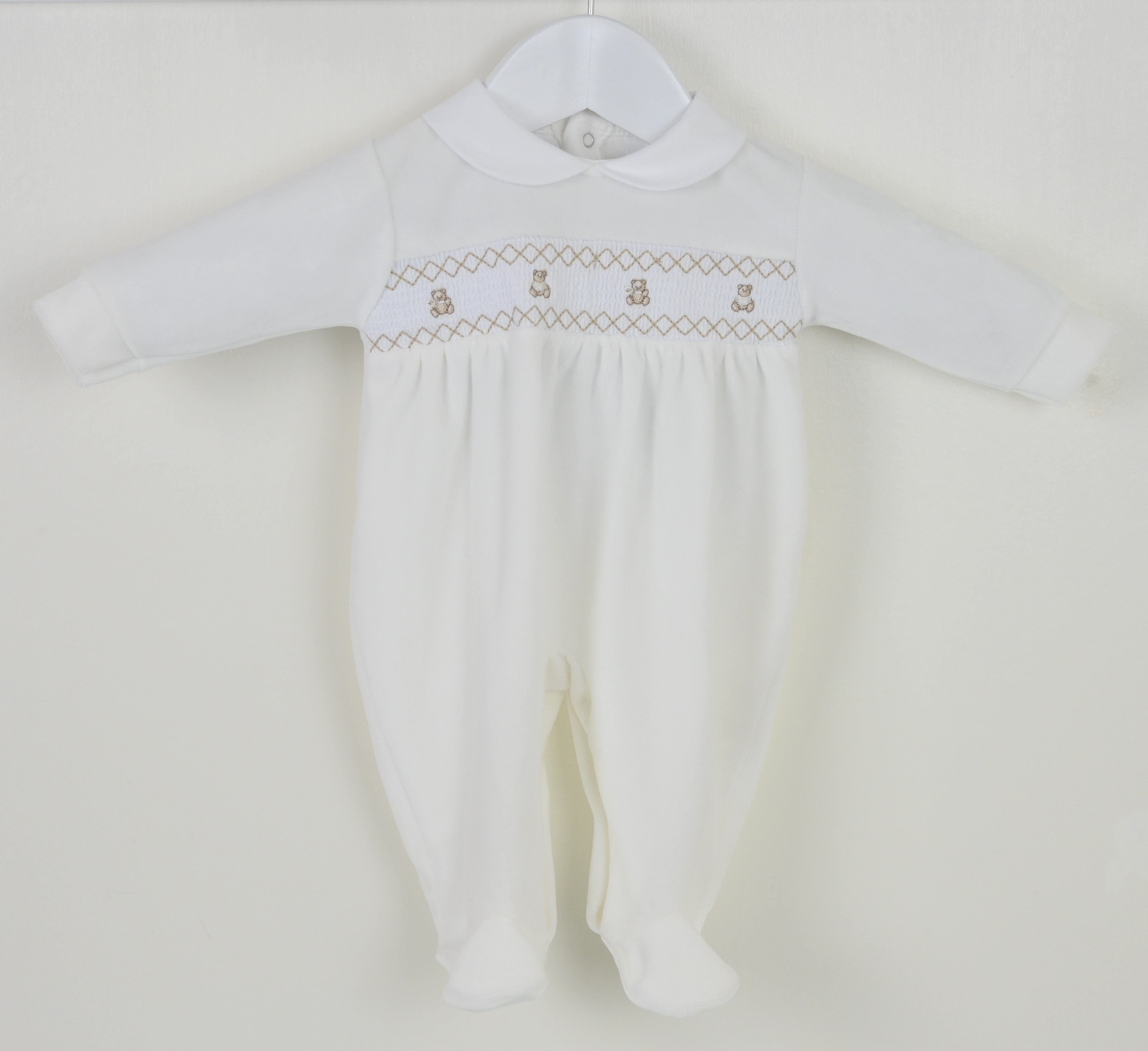 Drift off to dreamland in the gorgeous Pex brand Teddy Smocked Baby Sleepsuit Ivory. Perfect for snuggles, naps, and all the special moments in between, this lovely little cotton-rich velour baby sleepsuit is specially designed to offer unrivalled comfort against young skin and promote healthy sleeping. A truly special little sleepsuit for bedtime cuddles!